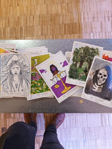 First quarter of 2023, Souverain·es has had the privilege to be at the studio 13/16 for 4 months representing the questions of gender, food crisis and climate crisis. I was invited by Richard otparlic presenting his own tarot and workshop on « tarot (re)interpretation » alongside the work of Delphine Denereaz and Valentin Ranger.
